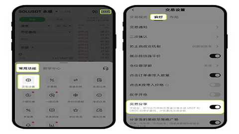 在交易页面,点击右上角的设置图标,选择【常用功能】-【交易设置】-【偏好】,然后打开【交易分享】功能。