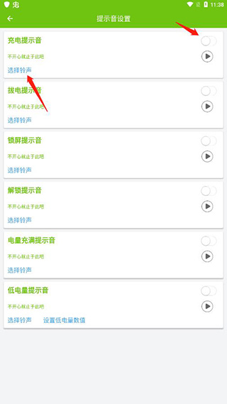 6、选择需要开启的提示音,比如充电提示音,选择铃声就好了。