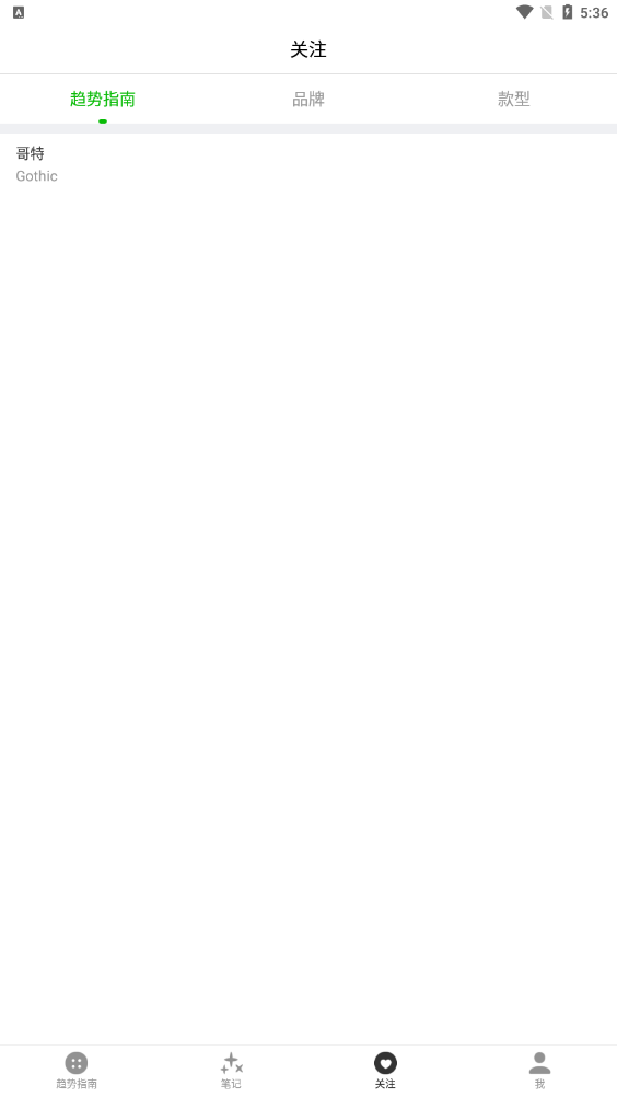 3、登录以后,用户可以在趋势指南、品牌与设计师、款型下面点上小爱心,就可以添加关注,如果有新的内容更新,就可以在【关注】功能栏这里看到;