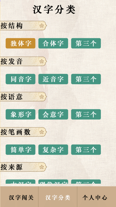 2、此外,应用还系统地分类汉字,帮助用户理解汉字的构造和意义。分类方式包括按结构、按发音、按语意、按笔画数等,每种分类都有详细的解释和示例,增进用户对汉字多样性和丰富文化内涵的理解。