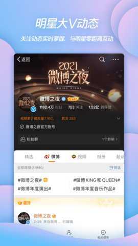 1、明星大 V动态,大量明星在微博上发表动态,点击关注,就可以和你喜欢的明星进行交流。