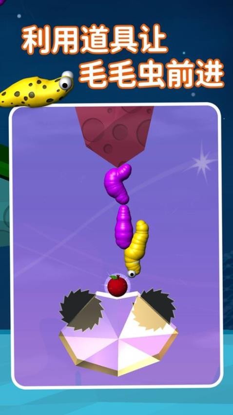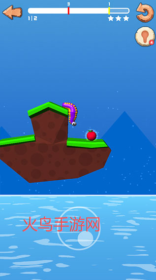 2、点击中间按钮进入具体关卡,初始形态是一对可爱的小眼睛,通过虚拟摇杆控制身体的伸缩与移动,吃掉地图中的苹果。