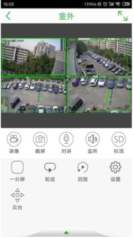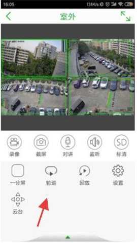 3、在监控画面界面,可进行录像截屏,对讲等操作,点击轮巡,可切换监控画面显示模式,方便查看多个监控区域。
