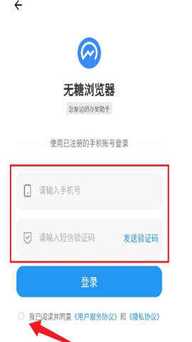2、返回登录界面,使用手机号和验证码进行登录,便可以开始畅享无糖浏览器提供的各项服务。