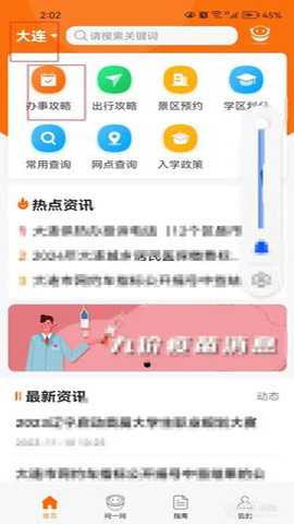 第一步:打开辽事通软件,点击选择【大连】,然后点击【办事攻略】