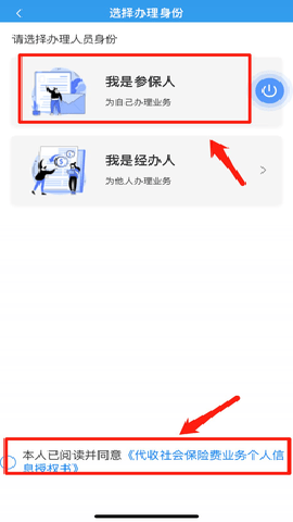 3、阅读下方授权书并勾选同意,点击并选择“我是参保人”选项,根据提示验证身份后完成缴费。