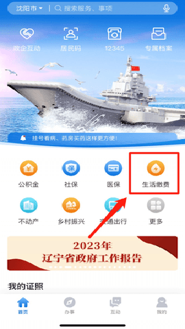 1、下载安装并打开“辽事通”APP,在首页点击“生活缴费”;
