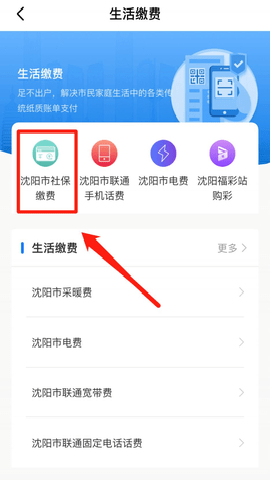 2、点击“沈阳市社保缴费”;