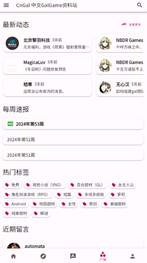 CnGal资料站中文版最新版是一款专为ACG爱好者打造的资源查询与分享平台,集最新资讯、作品评价、内容交流于一体,为用户提供全面且及时的ACG领域信息,助力用户轻松获取第一手精彩内容,提升对ACG文化的认知与理解。