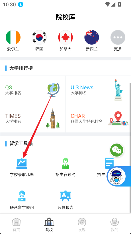 1、打开芥末留学App,在底部导航栏中点击【院校】进入院校查询页面。