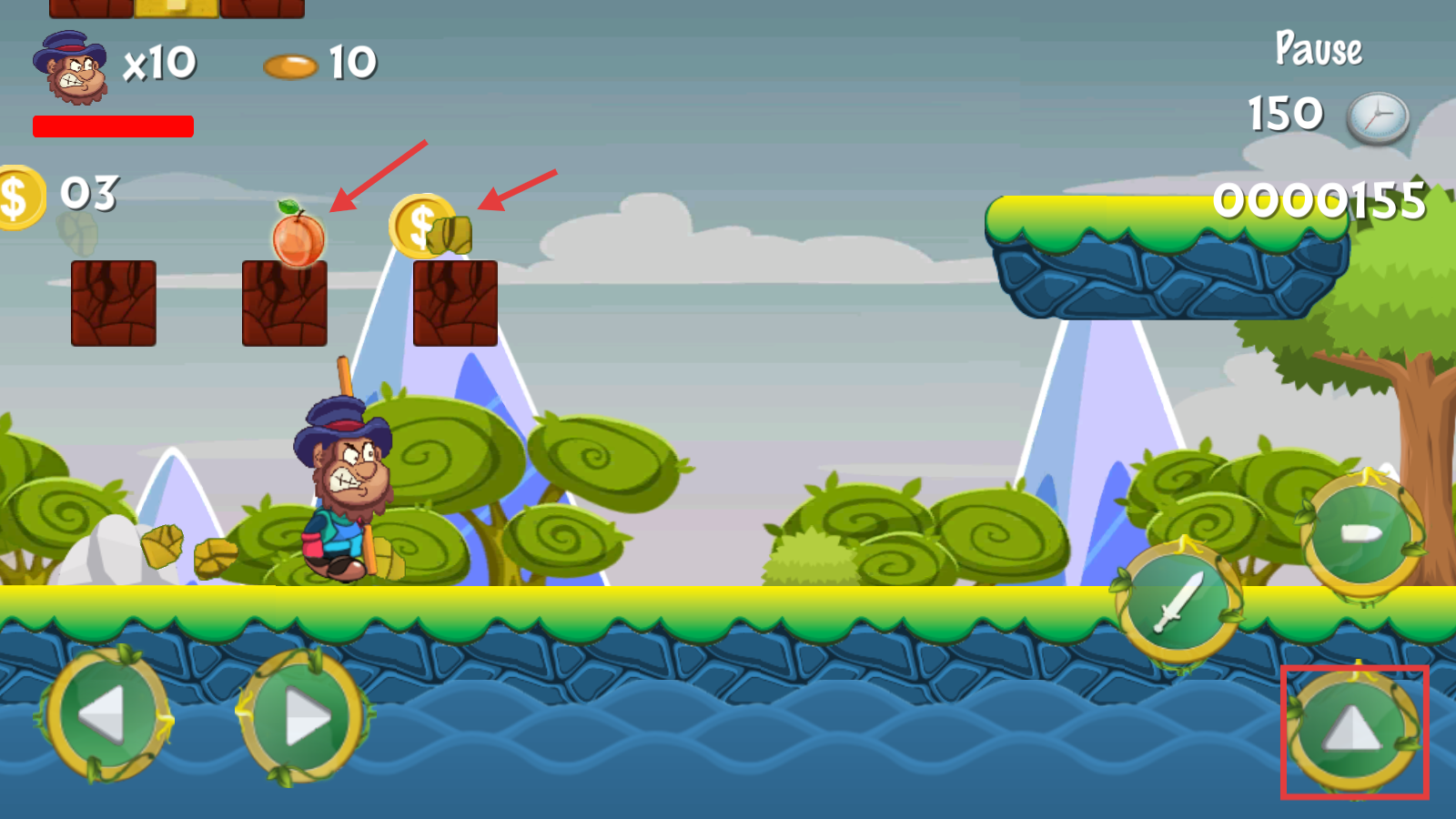 3、看到水果和金币,我们可以操控角色去收集,同时点击跳跃按钮,让角色跳到高处。