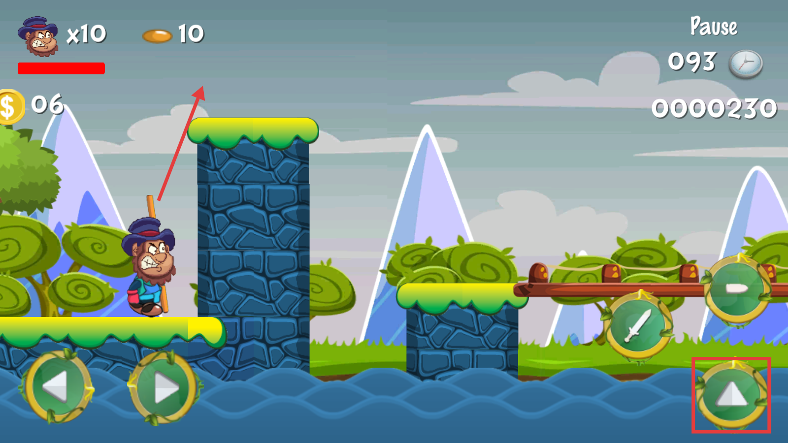4、面对较高的平台,我们多次点击跳跃按钮,助力角色成功跳到平台上,继续冒险。
