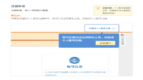 如果您希望以个人身份注册,您可以点击页面右上角,切换成个人账号注册。