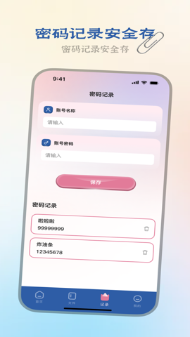 2、用户可以存储文档密码、网站账号以及备注信息,并通过主密码进行安全管理。