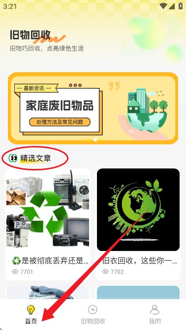 2、进入软件首页后,可看到多篇关于旧物回收的精选文章推送。