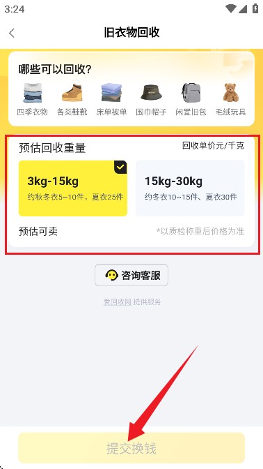 6、填写旧物相关信息,预估回收重量与价格,满意后即可提交变现。