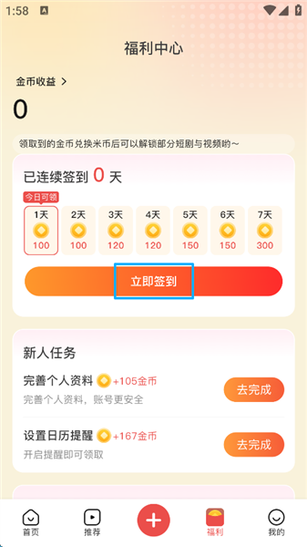 2、点击“签到”,签到所得的金额也会逐渐增长。