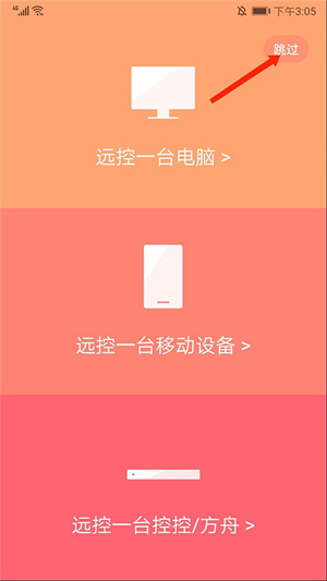 1、打开向日葵主控端手机版,登录后提示可选择远控一台电脑、远控一台移动设备和远控一台控控/方舟,选择右上角【跳过】选项,