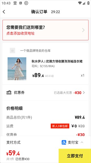 5、进入购物袋核对商品,填写准确收货地址,确认无误后完成支付。