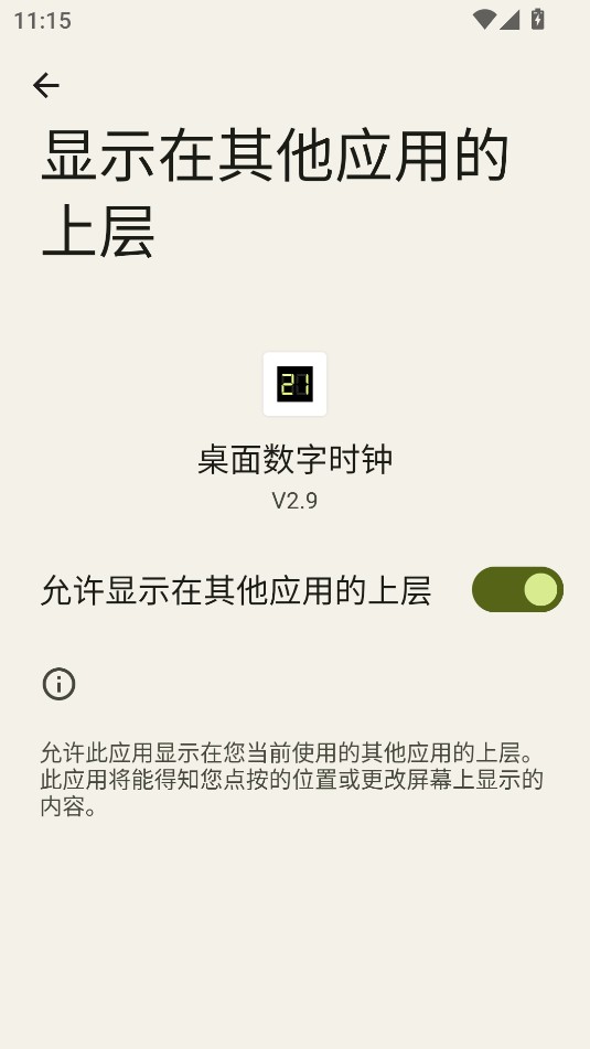 3、开启允许显示在其他应用上层,即可让时钟显示在屏幕顶层。