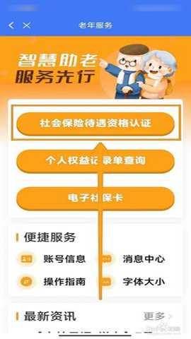 于老年服务页面内,选择并点击【社会保险待遇资格认证】选项。