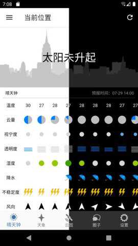 1、同时晴天钟按照经纬度显示天气数据、日落日出、落出等数据,主要用于天文观测。