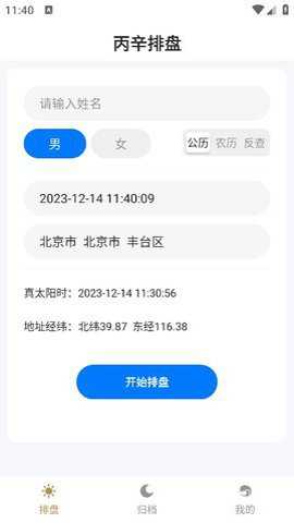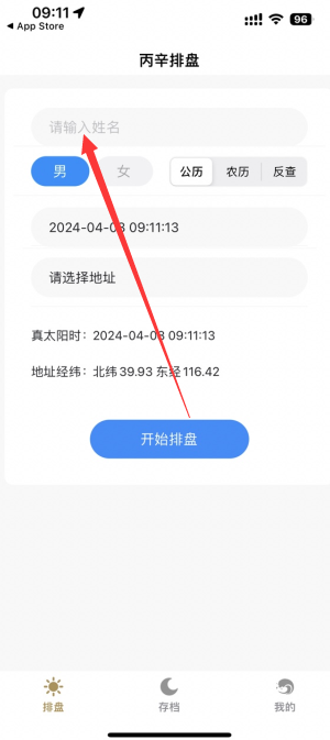 2.在这里填写名字以及生辰时间开始排盘