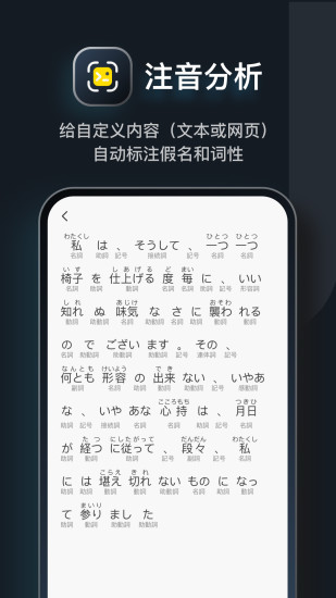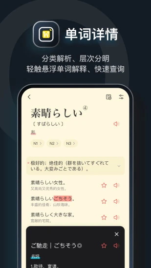 moji辞书根据用户输入的内容(中日、假名、罗马拼音以及英文),自动筛选搜索词条;内置三家权威日语在线搜索服务:日+中日+英日全面应对;moji辞书(日语词典),这里有丰富的词条,实时更新,为用户提供优质服务,操作简单,搜索方便哦!