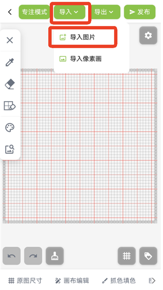 1、同样的进入到编辑页面后,点击上方的【导入】,选择【导入像素画】。