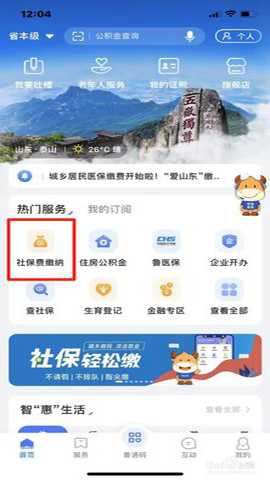 第一步:打开【爱山东】APP,点击【社保费缴纳】。