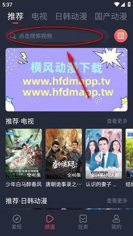 打开横风动漫app后,在“频道”界面点击最上方的搜索框,如图所示;