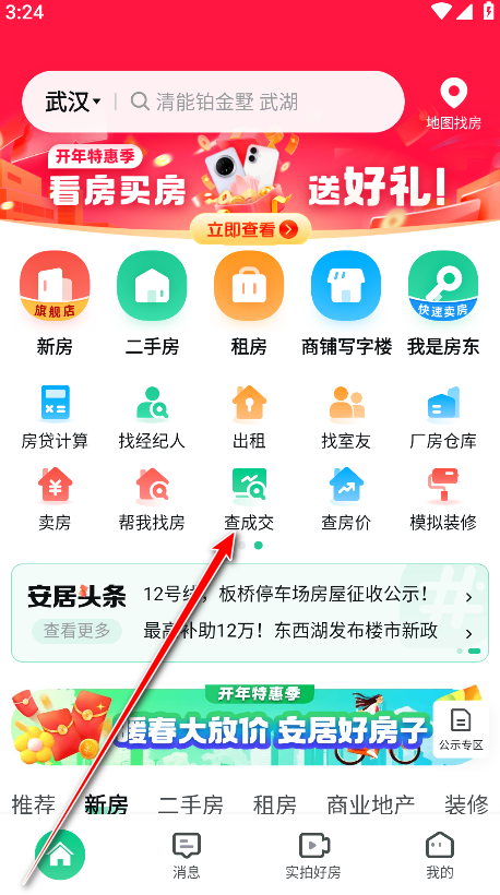 1.打开安居客,向左滑动选项,找到并点击查成交。