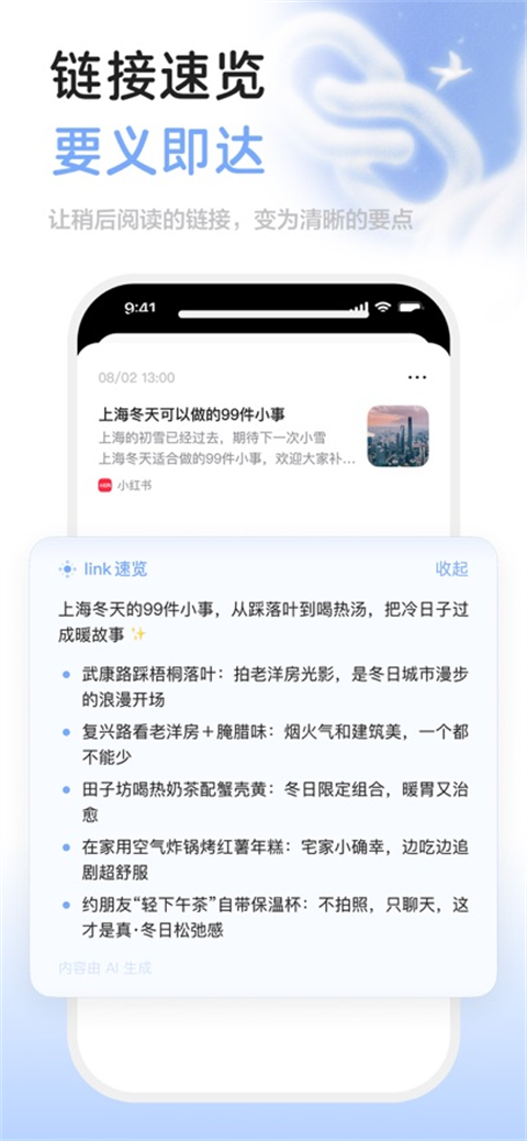 4、链接可自动速览,提炼网页与文章核心,快速获取重点。