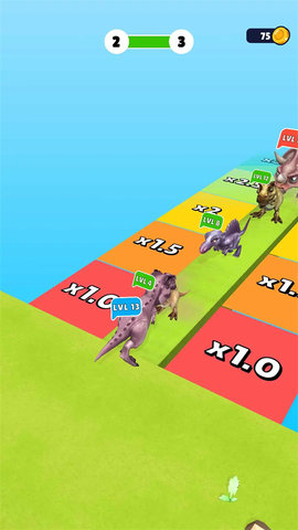 恐龙战争合并奔跑(Merge and Run)是一款超级好玩的休闲跑酷类型游戏,玩家们需要在游戏中不停合成恐龙,相同等级的恐龙拖到一起就可以合并为更高等级的恐龙了,等级越高的恐龙就拥有越高的速度,当然,你还可以给恐龙安排上武器,可以去攻击其他玩家哦。