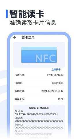 NFC助手是一款常用的手机nfc软件,能够帮助用户进行NFC读写卡操作。用户可以将IC卡中的信息凭证封装成数据包存储在支持NFC的外设中。软件界面设计简洁友好,操作简单,没有烦人的广告植入,用户体验非常好。软件还提供了卡片管理功能,用户可以方便地管理卡片,添加卡片并进行统计管理,实现在线简单读卡操作。