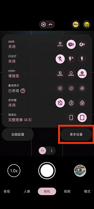 1、打开手机上的谷歌相机,选择右侧方的更多设置