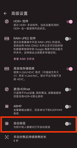 3、随后我们就可查看到谷歌相机中的自动夜视该选项了