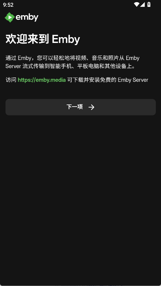 1、打开Emby安卓客户端,点击下一步