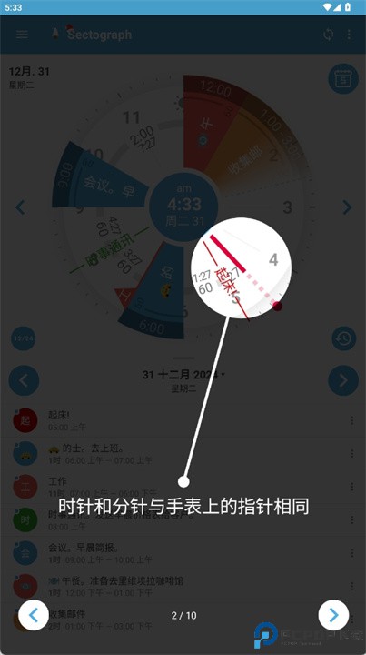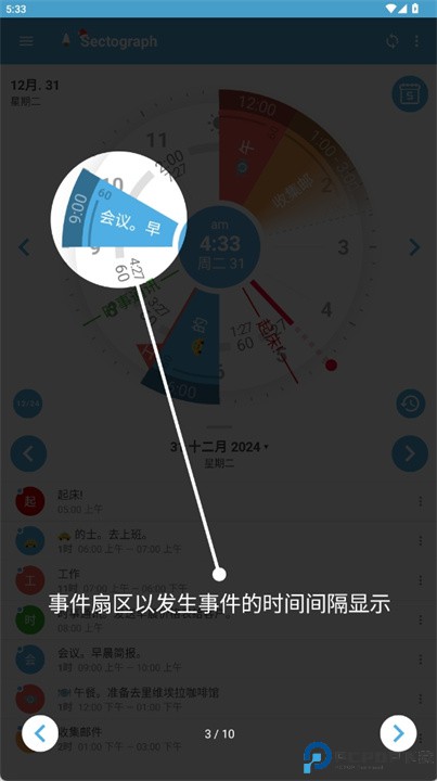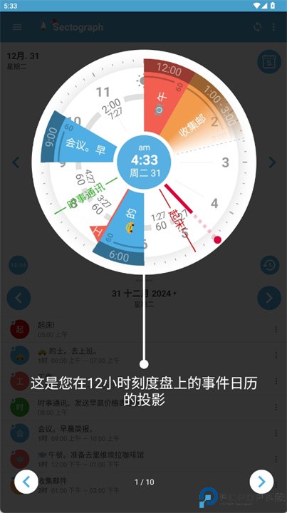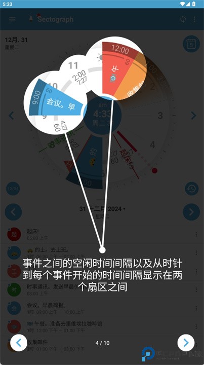 1、 圆盘视图:采用十二小时环形布局,将一天事务按时间段分布显示,形成直观的时间地图。