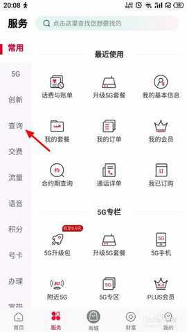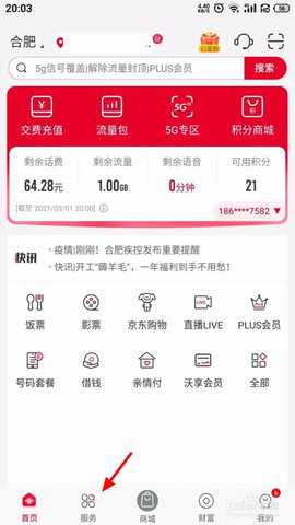 在手机营业厅首页页面,点击 服务;