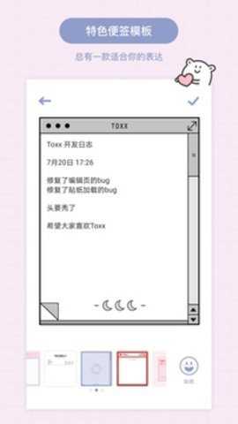 Toxx是广州曲速创想科技有限公司推出的治愈系日记便签本,温馨可爱的界面给用户最舒适的使用体验。你可以将自己的心情记录在日记中,上百种不同的贴纸帮助你诠释自己的心情,多种字体风格,让你的日记与众不同。
