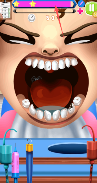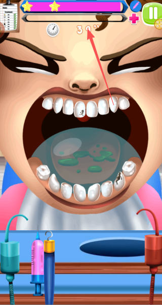 3、限时工具治疗是核心玩法,需在规定时间内用对应工具处理蛀牙、牙垢,操作有明确目标,避免玩法松散,提升专注度。