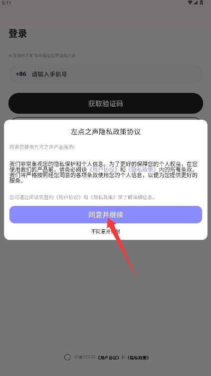 1、打开左点之声应用,仔细阅读用户协议与隐私政策,确认无误后点击同意并继续进入系统。