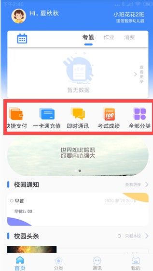 2、进入分类界面,汇聚各类校园信息与服务,可查看缴费、通知等板块,获取校园动态。