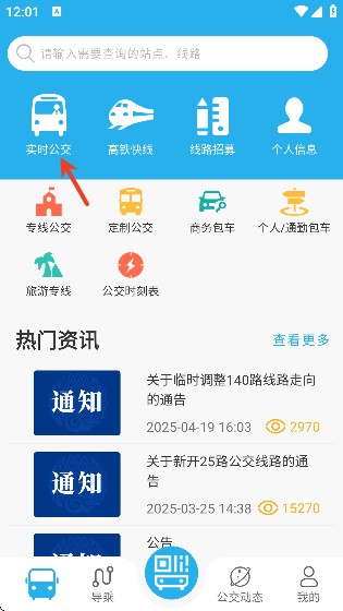 1、打开东营智慧公交 App,点击页面左上方的实时公交板块。