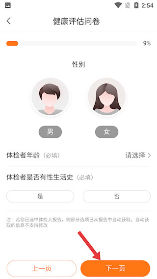 2、在健康评估问卷界面,准确填写性别年龄等基础信息后,点【下一页】按钮。