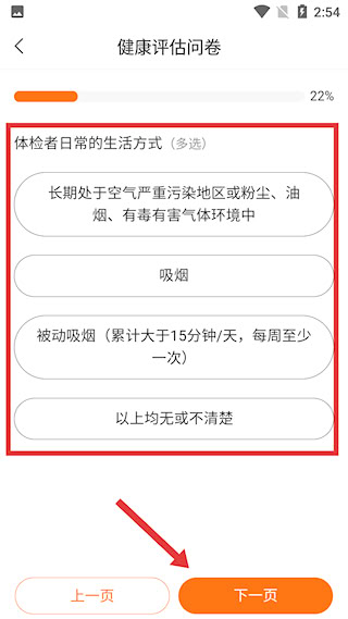 3、继续回答体检者生活习惯相关问题,完成后点击【下一页】按钮。