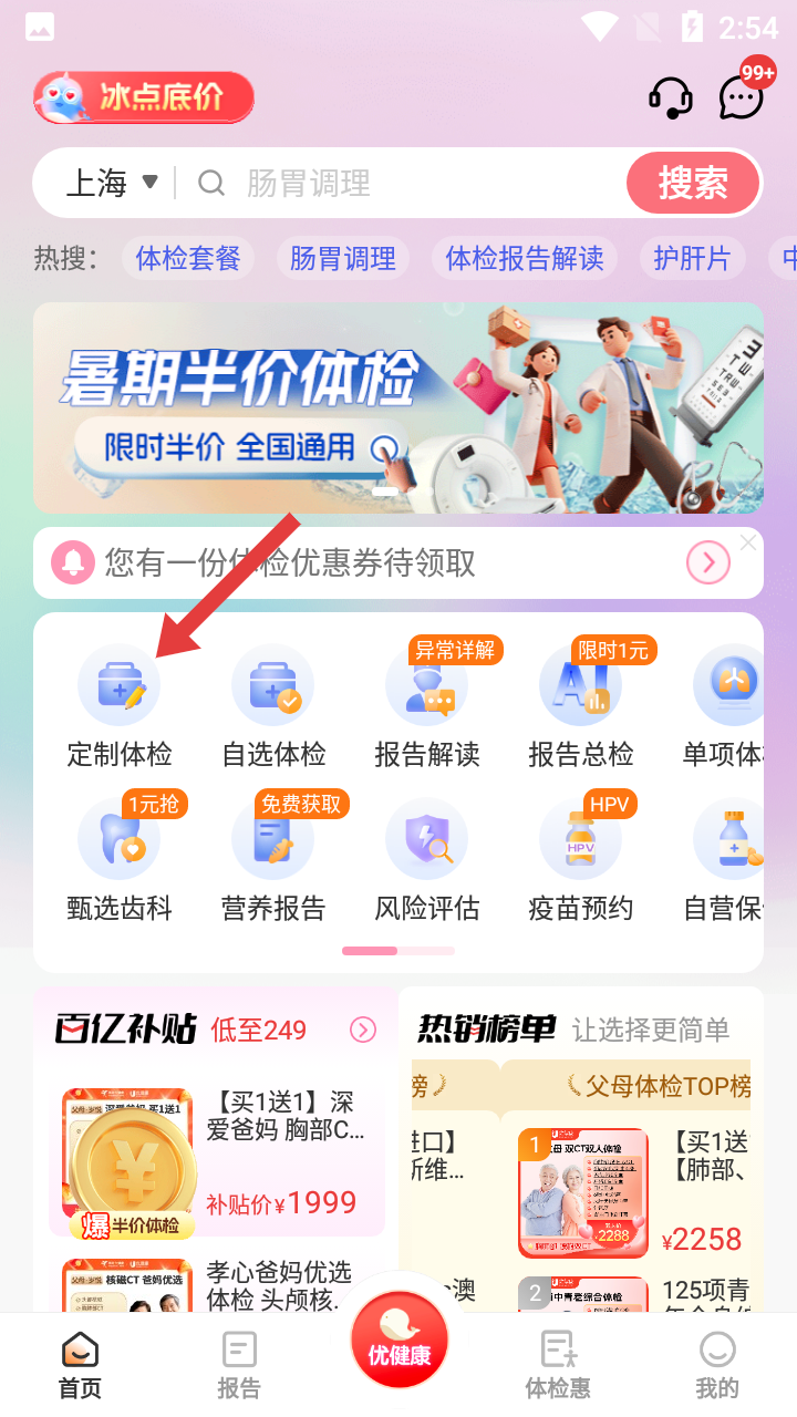 1、开启优健康软件,点首页【定制体检】按钮,开启体检定制流程。