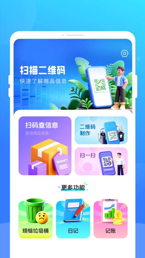 《二维码快扫通》是由兰溪市万豆网络科技服务有限公司开发的一款多功能二维码工具类应用。用户可通过该软件快速扫描各类二维码与条形码,即时获取对应信息。同时,软件内置便捷的二维码生成功能,支持生成文本、网址、联系人信息、WiFi连接等多种类型的二维码。此外,应用还整合了日记记录与记账等辅助功能,为用户提供更全面的日常使用体验。