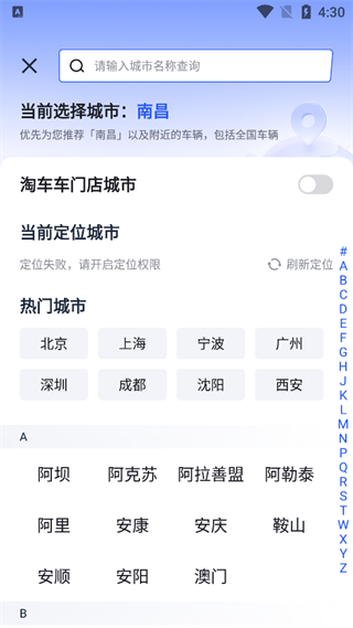 1、选择你的城市,系统会优先为您推荐填写的城市以及附近的车辆,包括全国车辆